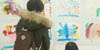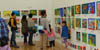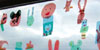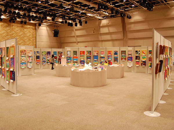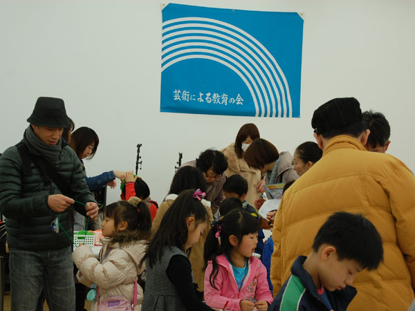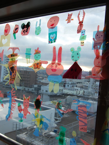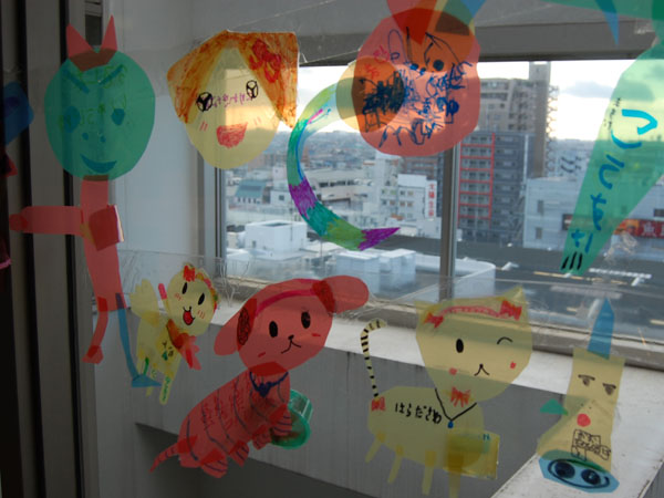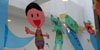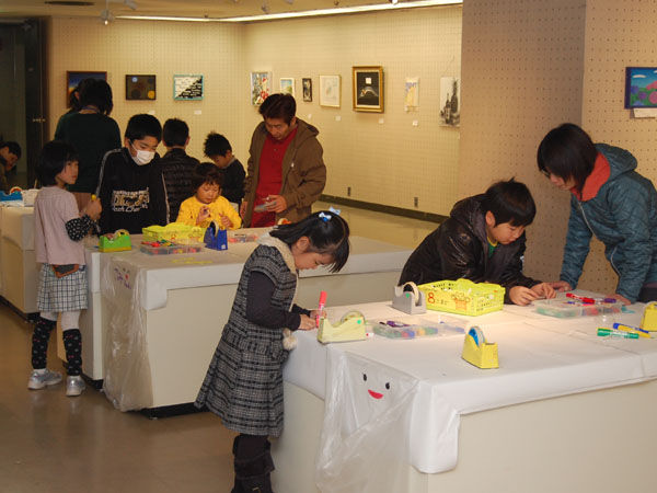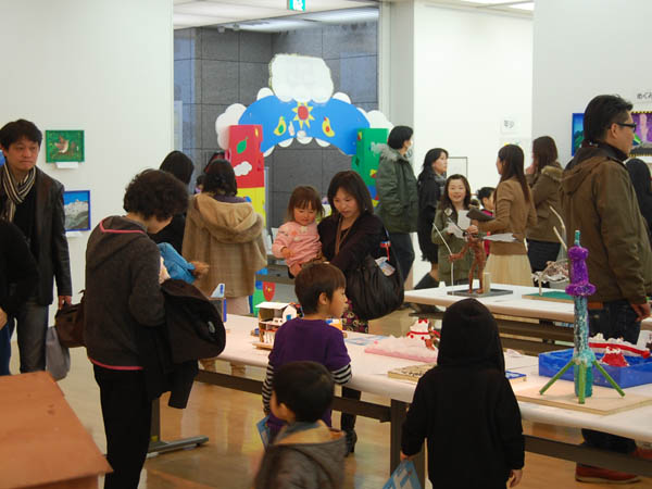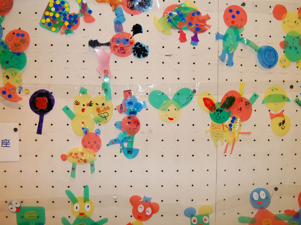 アートキッズでは、クリア—フォルダを使った工作で、子どもたち一人一人のアートキッズ君、アートキッズちゃんを作り、各会場に合わせて、とても素敵な展示になりました。