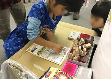 展覧会の会場に来たらまずは受け付けでスタンプカードをもらってください。 一緒に来ているお友だちの分も忘れないでね。 会場にあるスタンプを探してペタペタ押してください! |